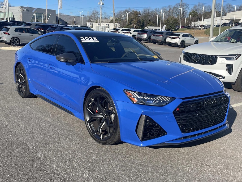 2025 Audi RS 7 performance 4.0T quattro Nogaro Blue quattro 8-Speed Automatic with Tiptronic 4.0L V8 TFSI 2025 Audi RS 7 performance 4.0T Nogaro Blue, Nogaro Blue, Black/Blue w/Valcona Leather Seat Trim, Alcantara Covered Steering Wheel, Audi Pre Sense Rear, Audi Side Assist, Bang & Olufsen Advanced Sound System w/3D Sound, Black Exterior Elements, Black Exterior Mirror Housings, Black Exterior Trim, Black Optic Package, Blue Contrast Stitching, Blue RS Design Package Plus, Carbon Twill Structure Inlays w/Blue Accent, Executive Package, Head-Up Display, Heated Rear Seats, Leather Package, Matte Carbon Exterior Mirror Housings, Matte Carbon Exterior Trim, Matte Carbon Package, Navigation system: Audi MMI Navigation plus with Touch Response, Power Liftgate, Power Soft-Closing Doors, Power Sunroof, Remote Park Assist Plus, RS Logo Floor Mats w/Blue Contrast Stitching, RS Sport Exhaust System, RS Sport Suspension Plus w/Dynamic Ride Control, Seat Belts in Blue, Wheels: 22' 5-Y-Spoke Design Bicolor Finish, Wheels: 22' 5-Y-Spoke Design Matte Black Finish.
